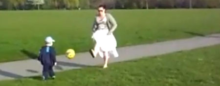 这位母亲在和小儿子玩儿足球的时候,不小心一脚把球踢到儿子脸上。小家伙一哭,妈妈慌了神儿,赶紧跑过去又搂又亲,儿子破涕为笑又追球去了,当妈的捂着胸口才舒了口气。下面的网址可以看到那段视频http://sports.yahoo.com/blogs/soccer-dirty-tackle/dtotd-mother-blasts-ball-her-kid-face-170928642.html